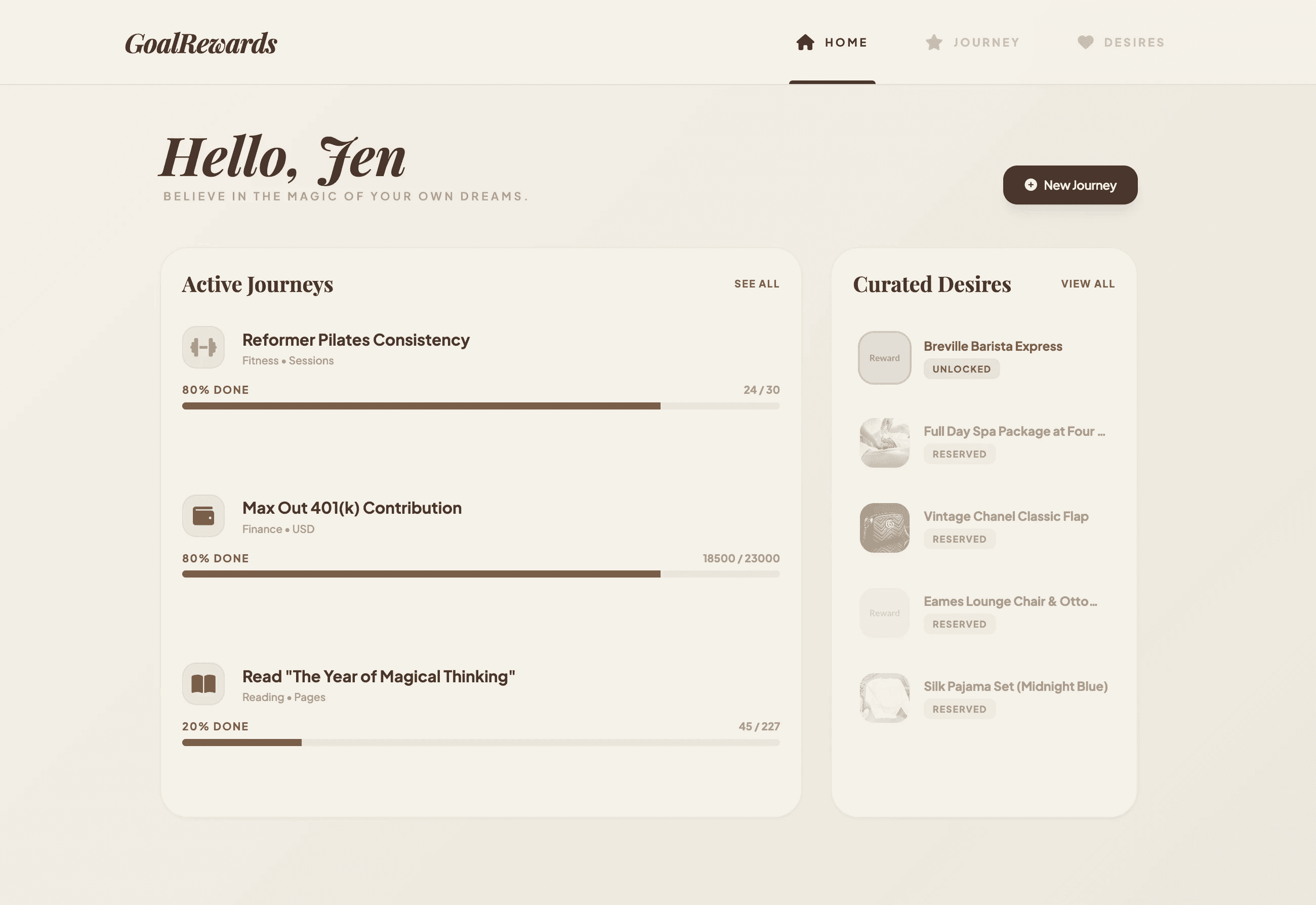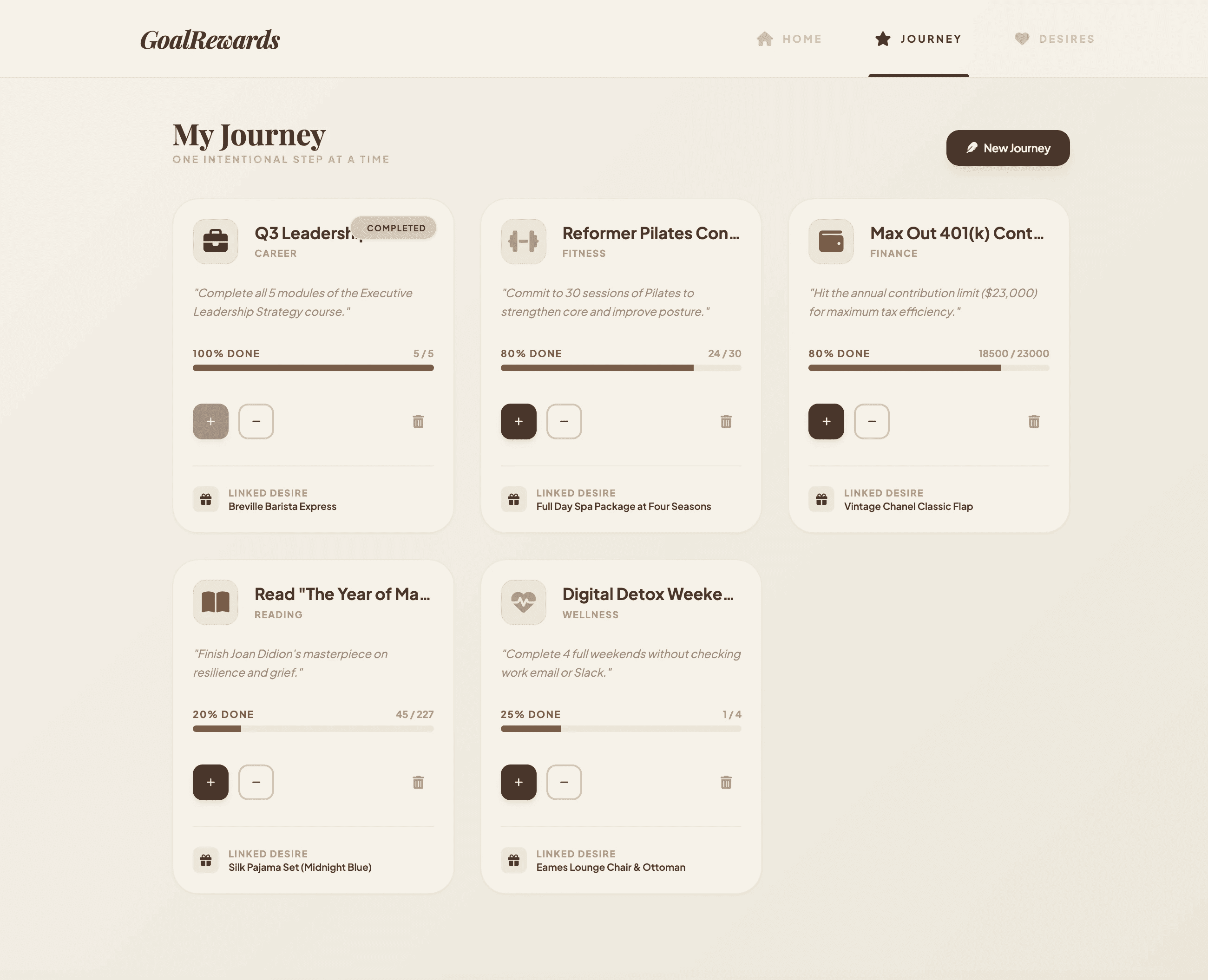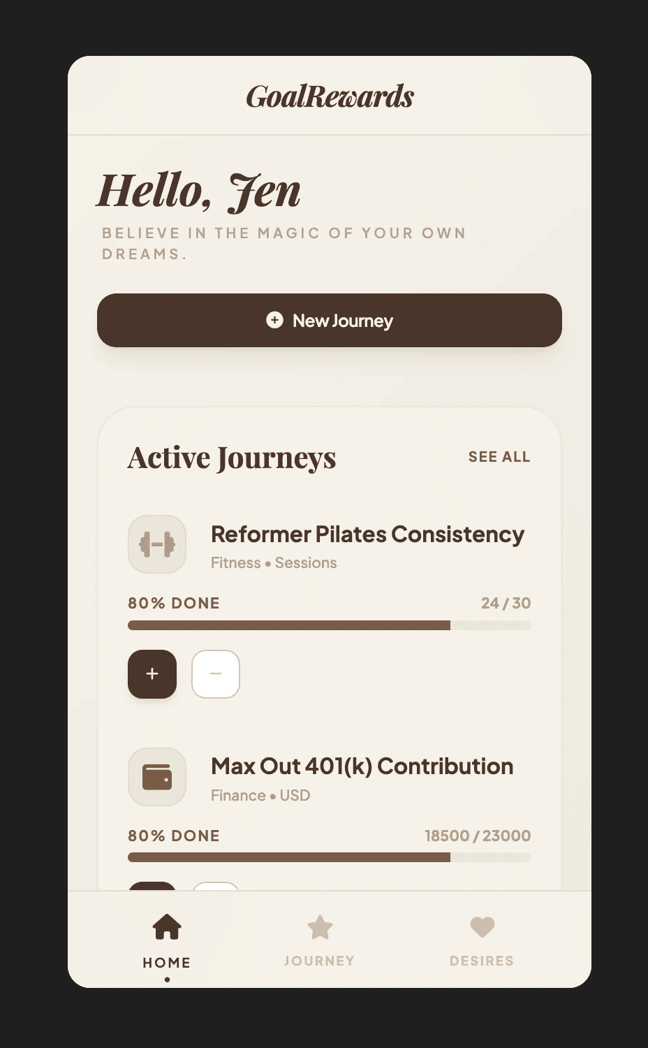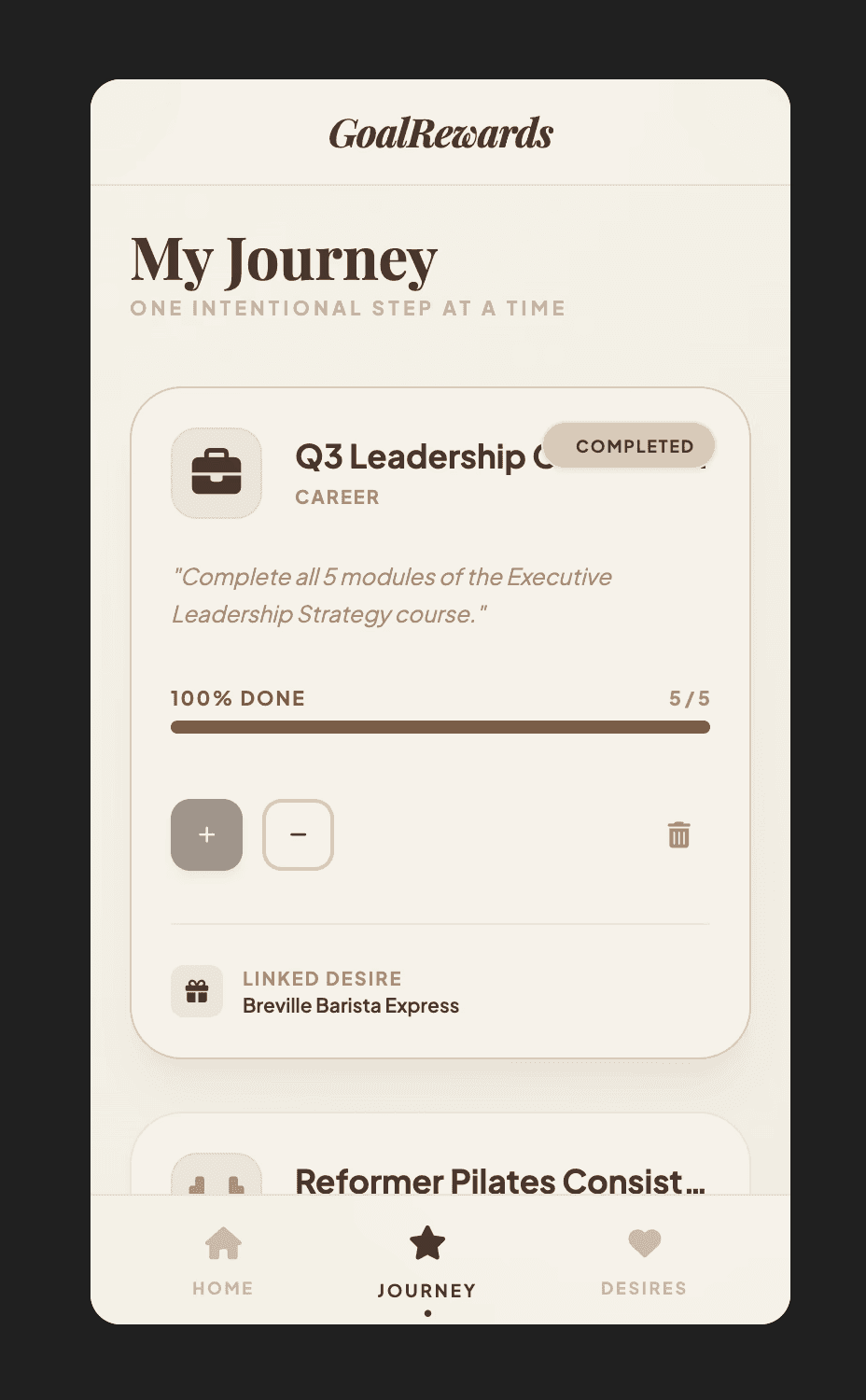 Locked Desires: A reward (Desire) must be linked to a goal (Journey) before it can start. Once the journey begins, the reward is locked and cannot be edited or cheated.